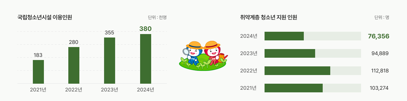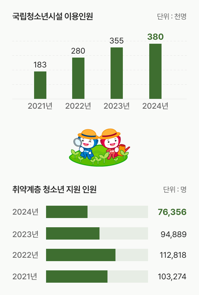 - 정신적, 신체적, 환경적 요인으로 인하여 교육, 문화, 복지에서 소외된 청소년의 활동 참여 기회를 보장하기 위해 다양한 활동을 지원합니다.
